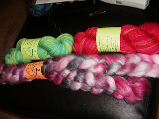 The green yarn is superwash merino. The pink yarn is Superwash BFL and the roving is a merino/silk blend that is soooo luscious. I can't wait to spin it.